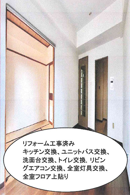 | 備考 | リフォーム工事済み キッチン交換、ユニットバス交換、洗面台交換、トイレ交換、リビングエアコン交換、全室灯具交換、全室フロア上貼り |